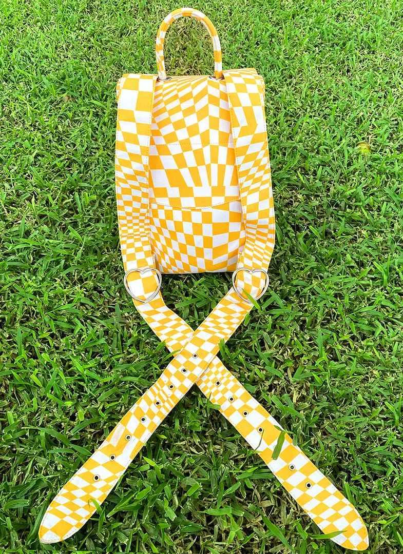 This yellow checkered backpack features heart buckles, magnetic closures, adjustable straps, a drawstring, canvas lined interior, and zipper pouch inside.