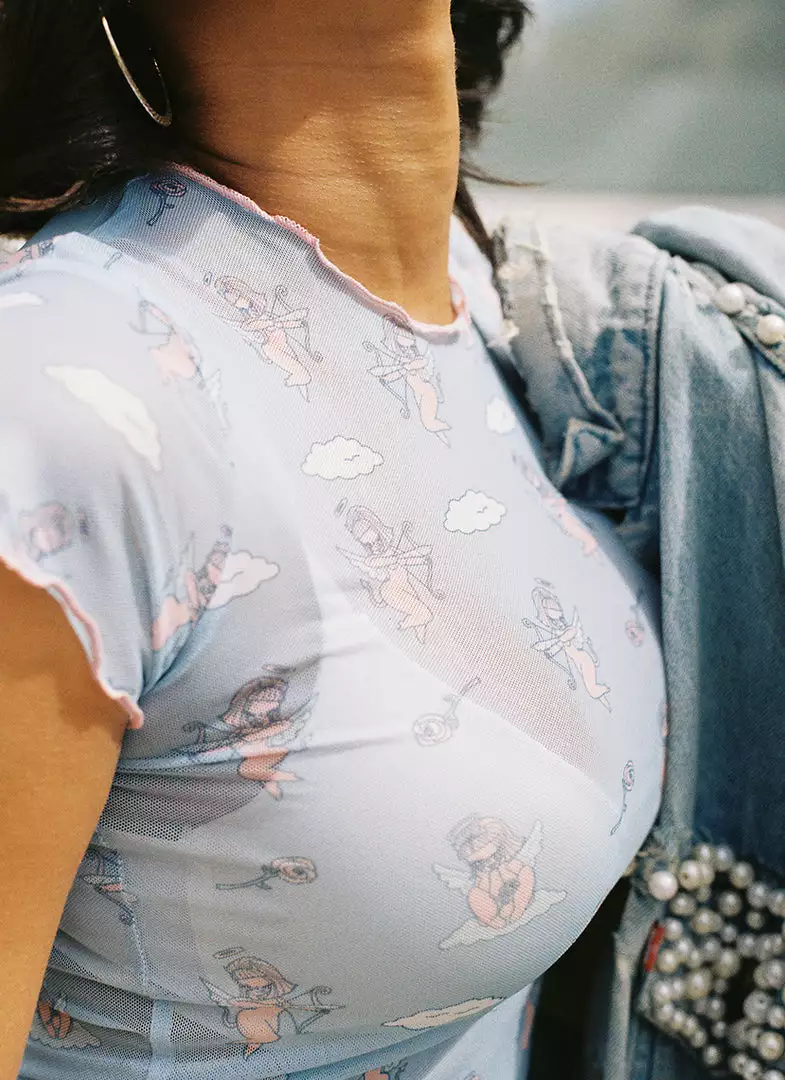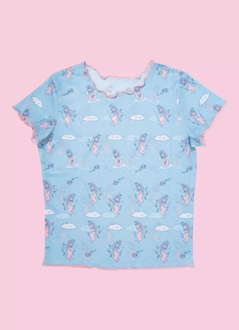 This blue mesh top features an all over Cherub pattern.
