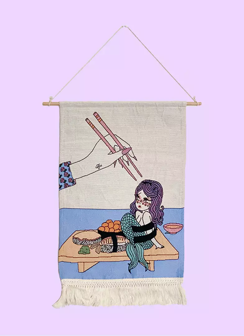 This woven tapestry features original Valfré artwork, a wooden rod to easily hang, and fringe at the bottom.