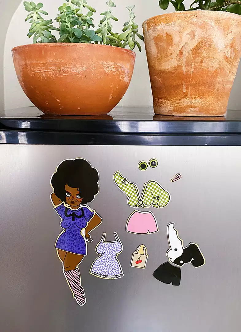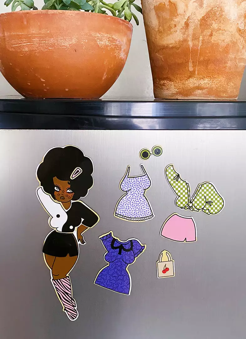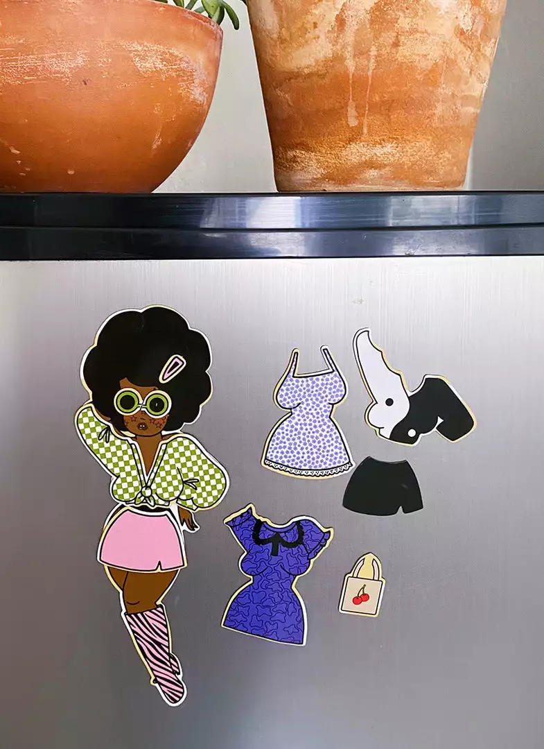 Style your fridge with new Valfré magnetic paper doll’s. Includes 1 Valfré girl and 9 items to dress your doll with. Use a scissors to cut closer to the lines, or make your own design.