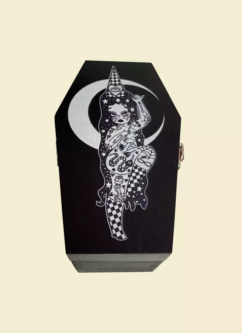This wooden black stash box features original Valfré Wizard artwork, a latch closure, and compartments inside.